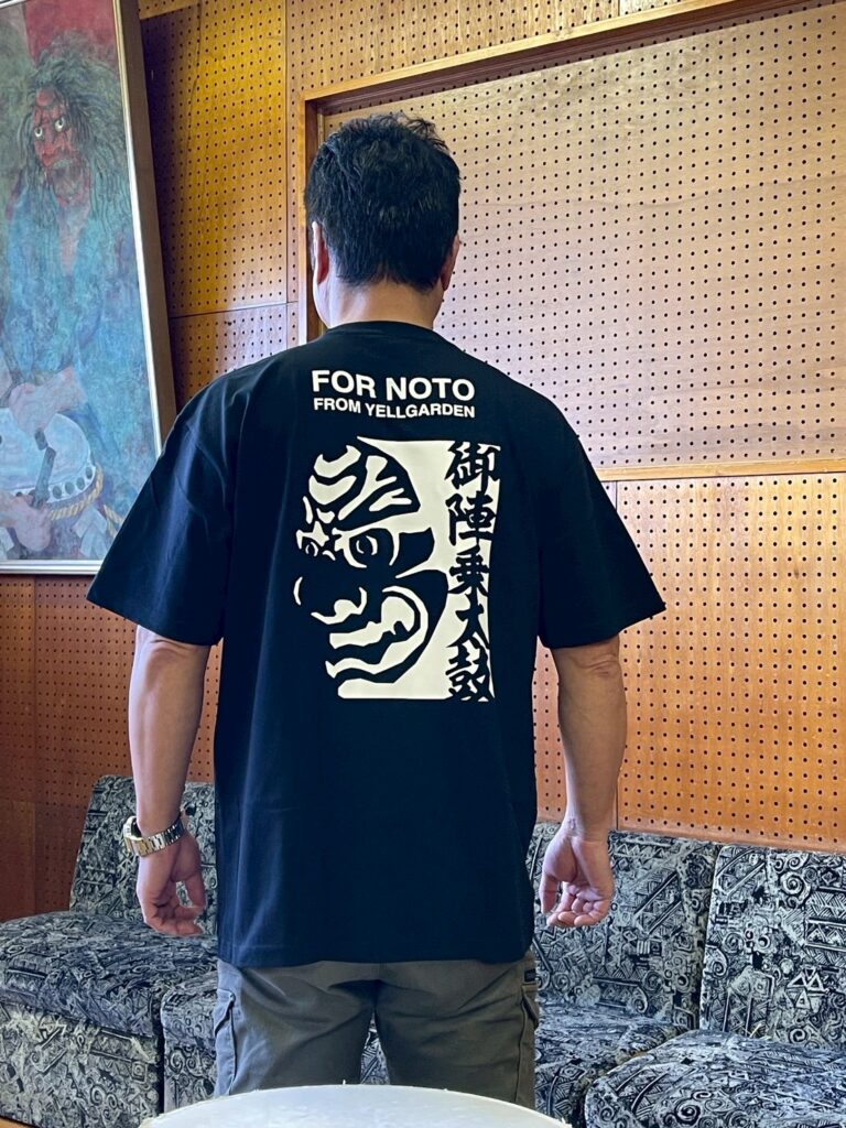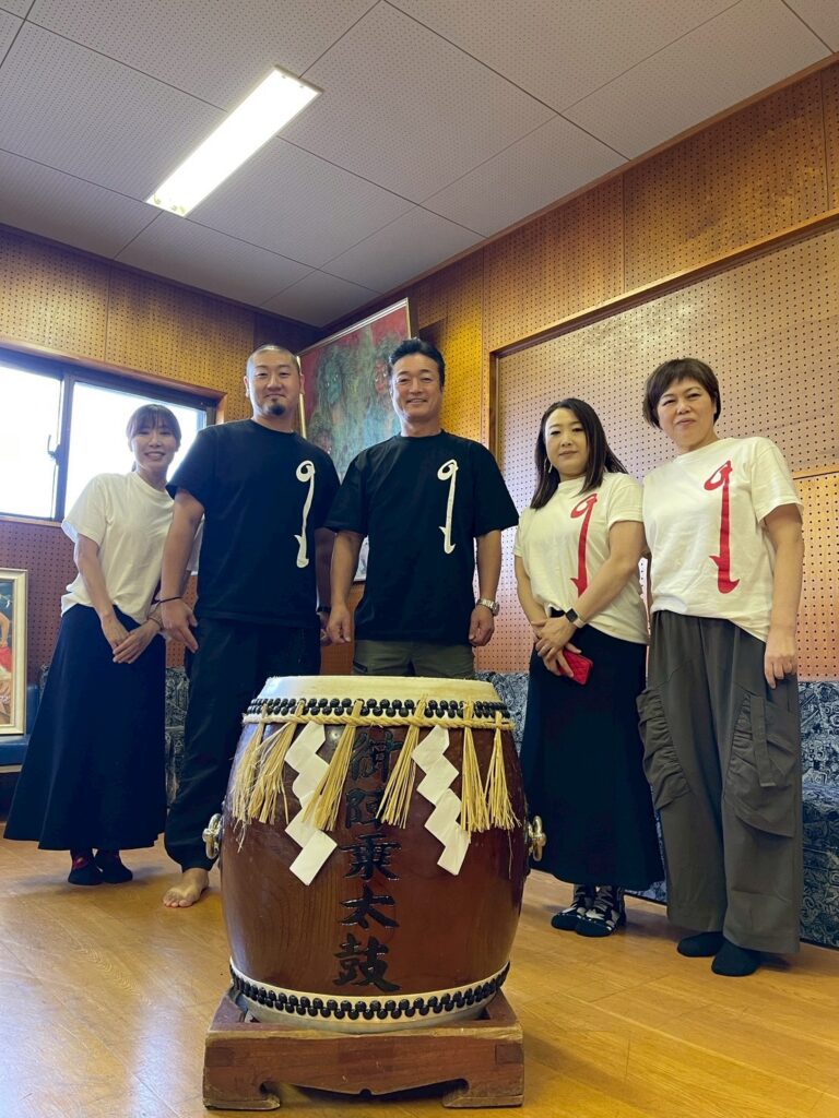 石川県小松市の能登復興チャリティーイベント「エールガーデン」主催者の華道家、中惣恭苑様から御陣乗太鼓Tシャツを頂戴しました。ありがとうございます。お忙しい中、中惣様とTシャツのデザイナー鵜川瞬也様、御有志のお二人の4人で名舟町まで来て頂きメンバー全員の御陣乗太鼓Tシャツを持ってきてくれました。みなさん、とても気さくな方々で凄く楽しい時間になりました。11月30日のアルプラザ小松での公演(中惣さんからの依頼)では御陣乗太鼓Tシャツ着ていきますね。