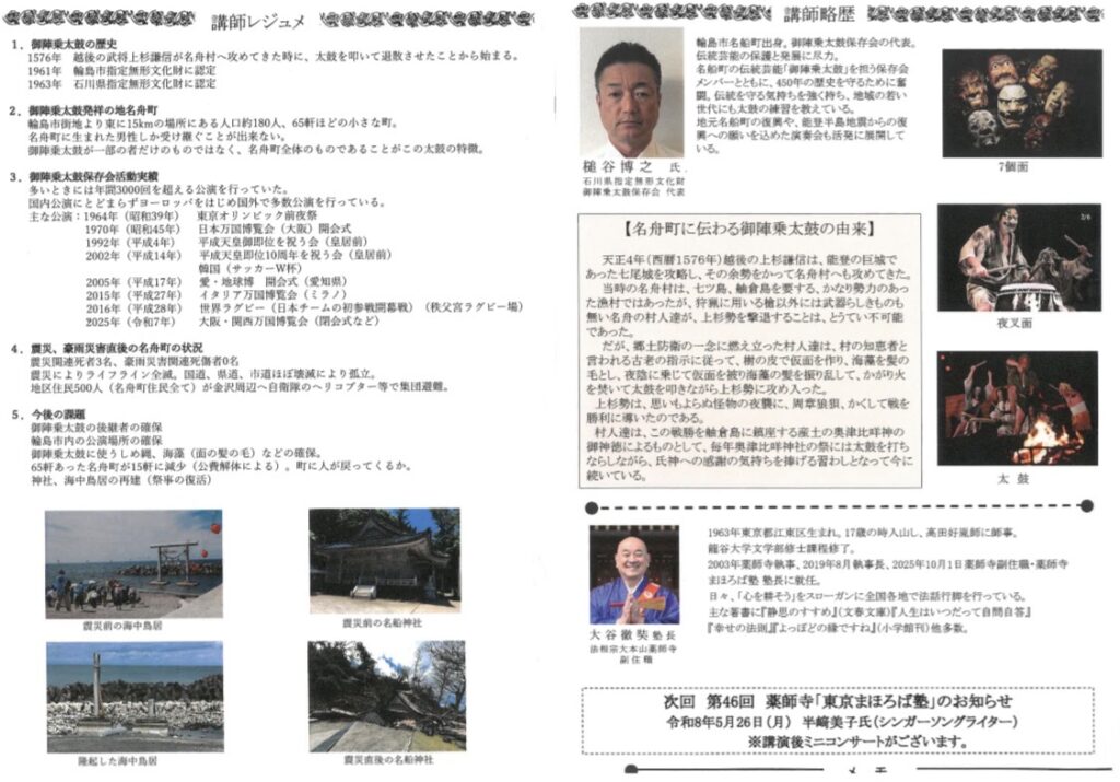 1月26日東京日本橋の三越本店内、三越劇場にて「薬師寺まほろば塾」主催の定例東京塾に講師として能登半島復興についてお話をさせていただきました。500人以上の満員の会場の壇上でとても緊張しましたが、御陣乗太鼓の想い、能登の未来について想いは、会場の皆様に伝わったのかなと思います。遠方からお越しになった方々も多くいらっしゃたみたいです。また能登の出身の方も多く来場していました。ご来場ありがとうございました。そして、講演の機会を設けていただいた奈良薬師寺には、この場をお借りして感謝申し上げます。