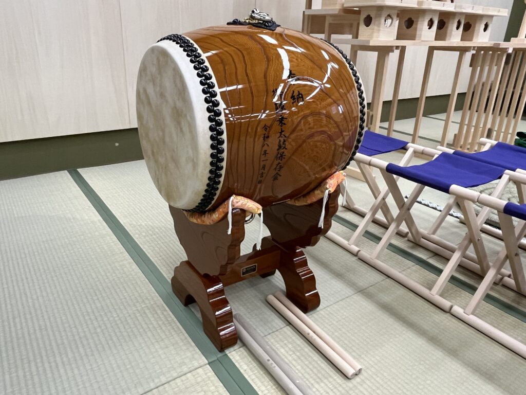 名舟町の祭りに使用する、宮司が使う太鼓がようやく完成しました。2024年の震災で壊れたので新調したものです。更に神事用の三方(三宝)や八足台、椅子なども新調しました。少しずつですが復興に向けて前へ進んでいます。