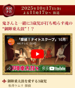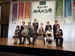 10月20日に大阪のリーガロイヤルホテルで「サントリー地域文化賞」の贈呈式、記念パーティーが行われ、サントリー文化財団理事長、鳥居信吾様より記念の盾を受け取りました。震災後から約1年間密着取材をしてドキュメンタリー番組を制作していただいたNHK名古屋放送局の吉田英司様からNHK金沢放送局を通じてご推薦していただき受賞する運びとなりました。この受賞を励みに、ますます精進して御陣乗太鼓を全国の方々に知っていただき、感動してもらえるよう頑張ってまいります。